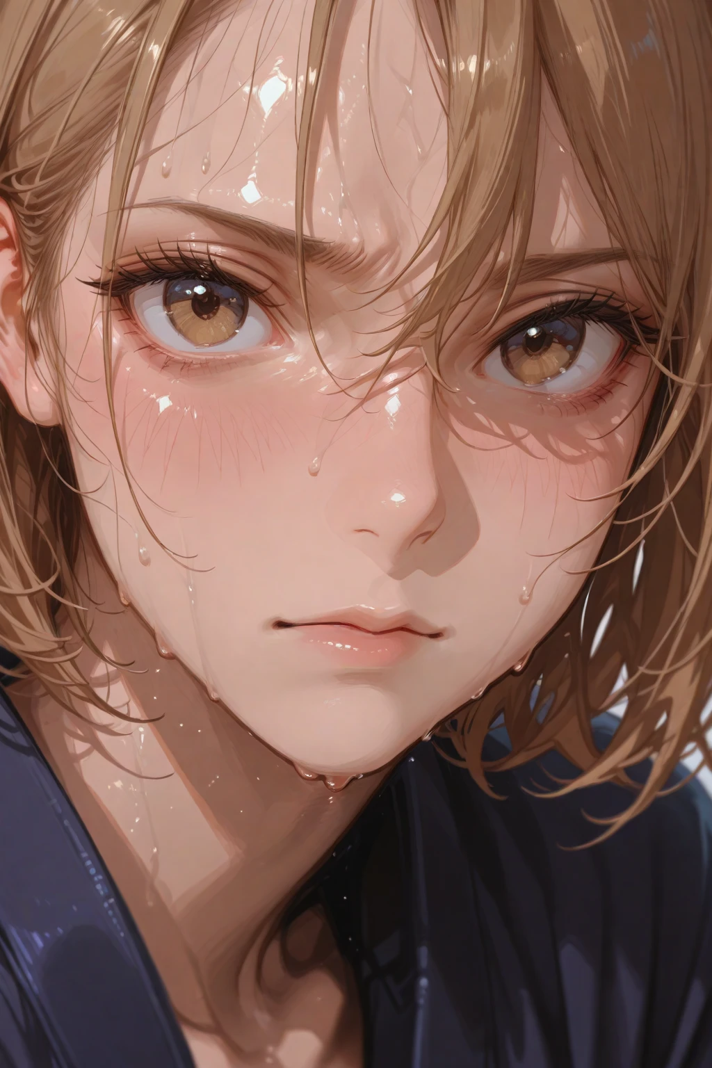 Close-up of a kendo beginner's eyes, intense gaze, sweat on forehead, shallow depth of field, emotional, hyperrealistic, 8k detail --ar 1:1 --style photographic