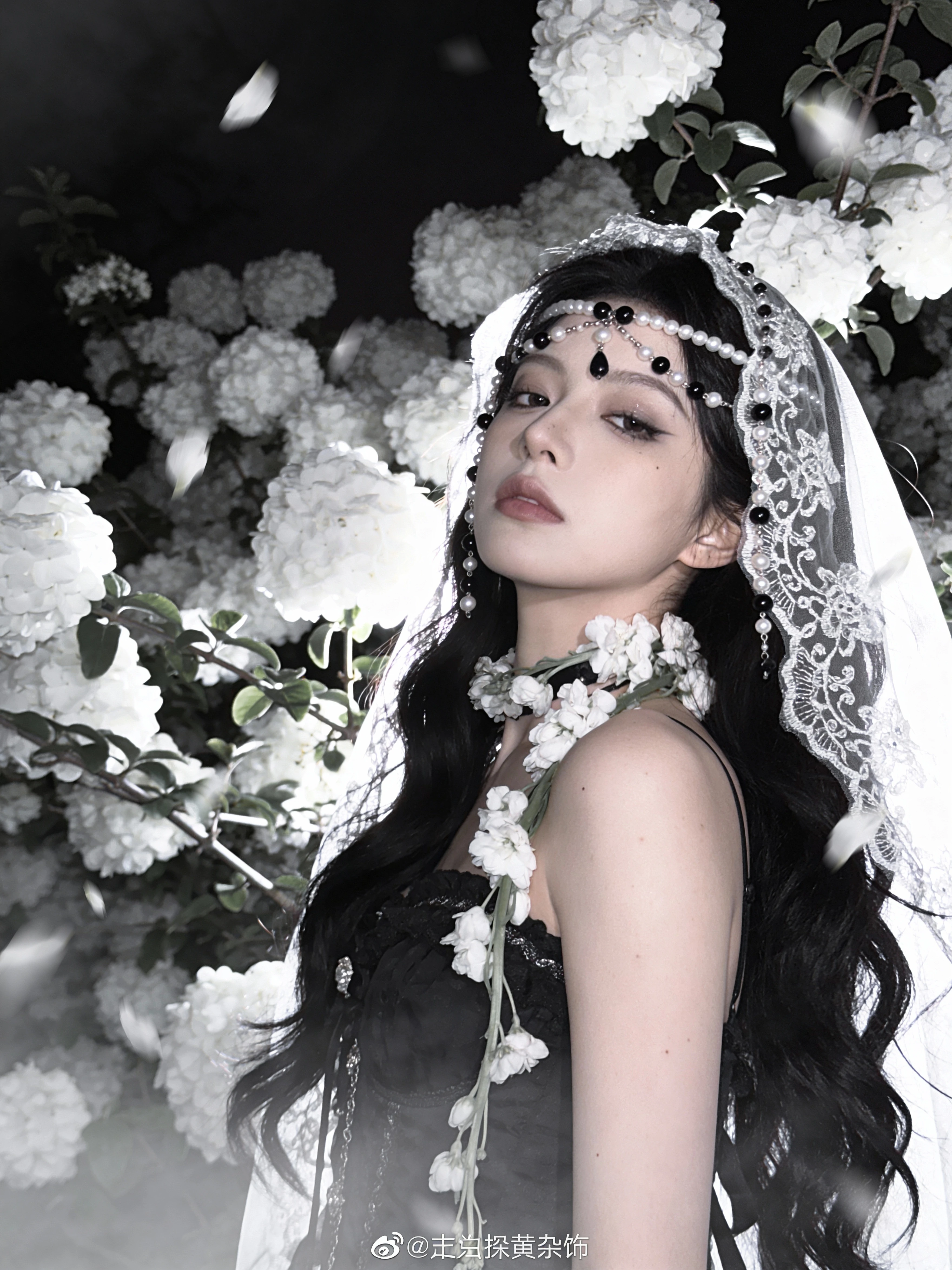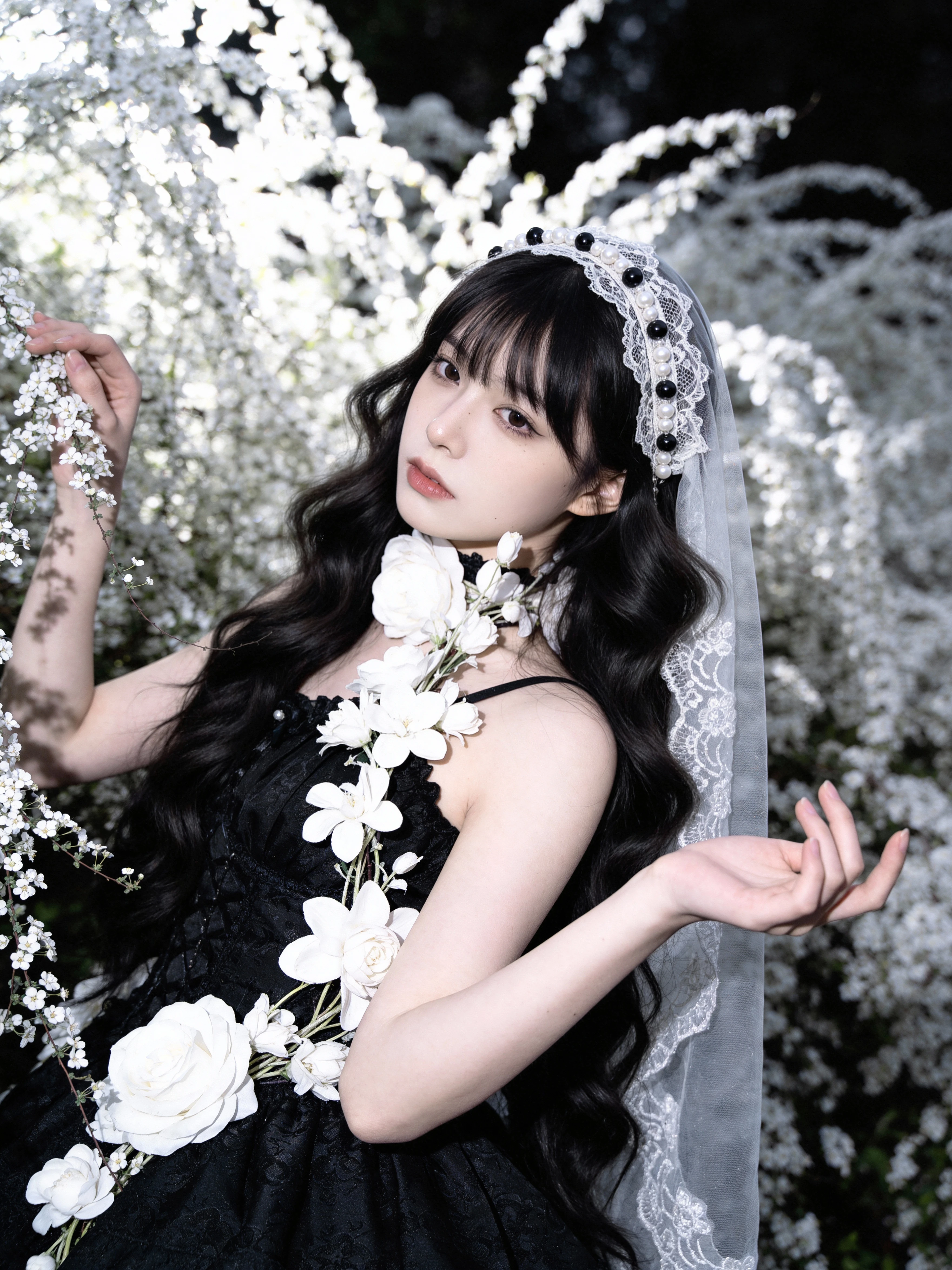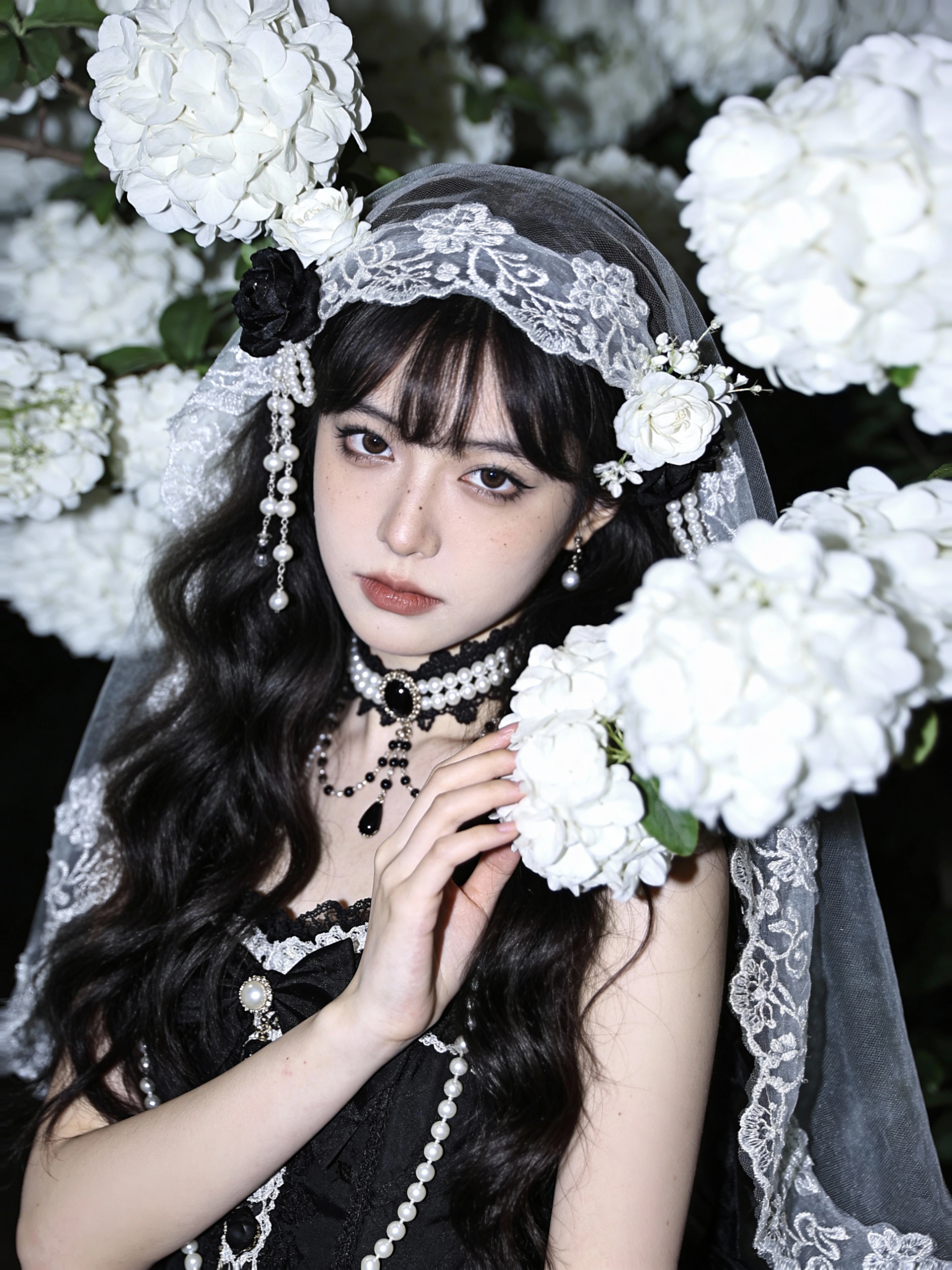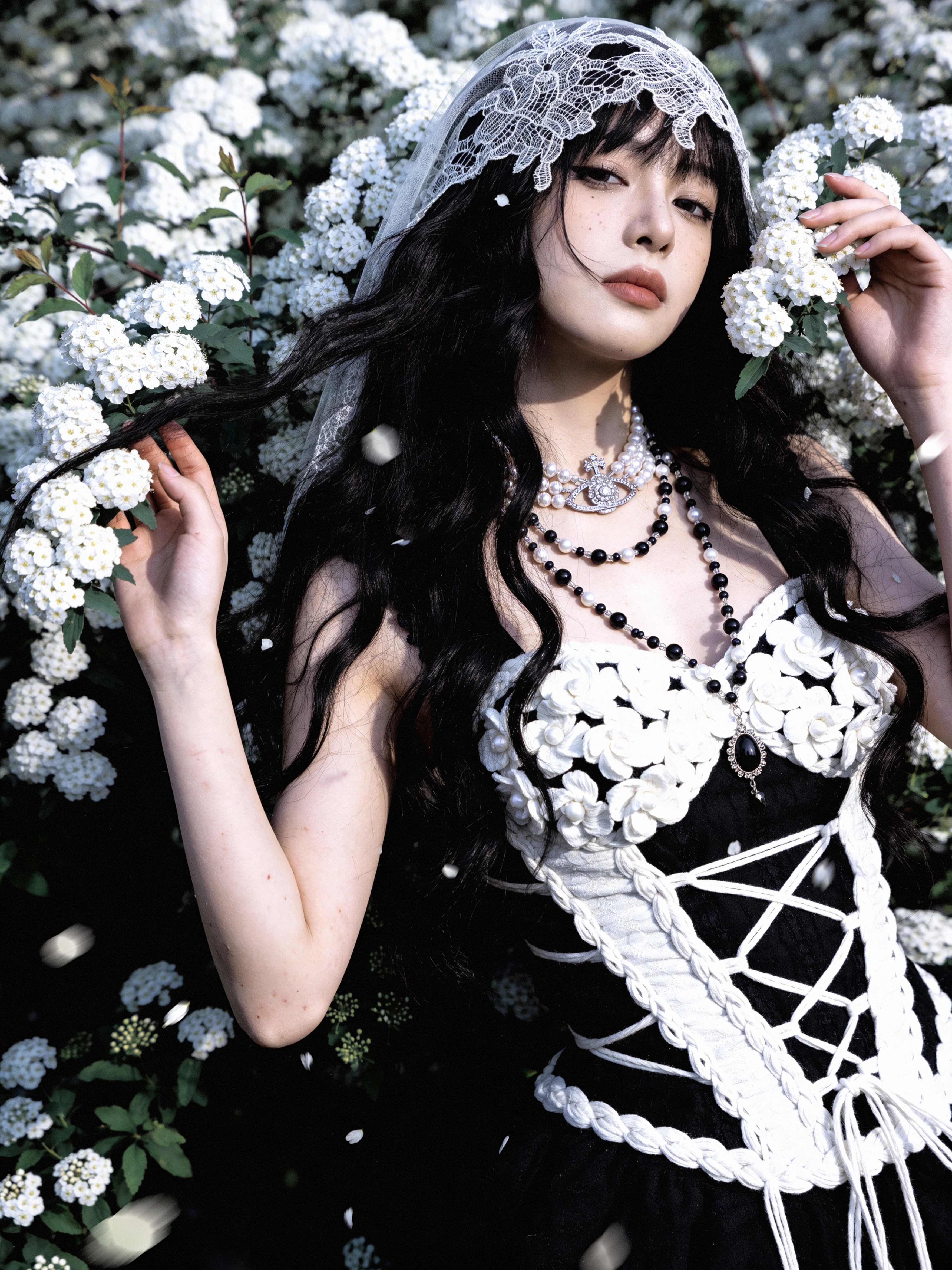 花系场景,白色花簇背景,营造神秘风氛围 美少女,冷白皮,美艳动人,黑色波浪卷长发到腰。装扮为神秘风造型(蕾丝头纱+黑白珍珠配饰+白色花艺),具艺术张力;互动姿态(花艺互动的艺术造型,具艺术大片感) 神秘洛丽塔风构图,结合元素(花簇背景与配饰细节)与肢体互动(清冷表情、互动动作),突出花嫁风艺术写真的风格细节 动作随性而为、人物表现自然随机,皮肤呈现真实状态,无磨皮,绝对不使用柔焦或美化处理。绝妙构图,高对比,泛朦,氛围感拉满,局部高清,深色加深,超现实,写意,高级感,杰作,身材好,实拍,背景材质真实化,绝对真实化场景,自然光,真人感,边缘轻微失焦,构图歪斜毫无设计感,非摆拍。绝对不要精致、不要磨皮、聚焦不要写真风。