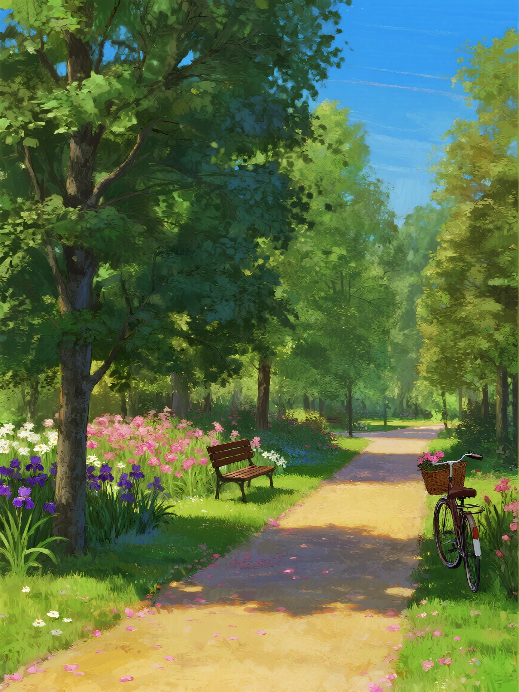 9:16画幅,8K超清,金政基(Kim Jung Gi)式极繁主义,半写实插画风格,硬线条弱化处理、边缘柔和,电影级柔和漫射春日阳光,高饱和度色彩,超广角满构图,无人物、无网状物体、无泡泡元素。画面主体为春日公园盛景,以高大悬铃木、香樟等阔叶树为主,灰褐色树干纹理粗糙、枝桠交错舒展,翠绿色浓密树叶层层叠叠遮天蔽日;嫩绿草坪铺满大面积粉色蔷薇,间杂紫色鸢尾、白色雏菊,花茎叶脉刻画极致细腻,花丛蔓延至树下、路边无留白;蜿蜒黄色沙土小路穿梭林间,路面散落蔷薇花瓣;深褐色木质长椅半隐于悬铃木树荫下,椅面木纹清晰;天空湛蓝澄澈,飘着几缕轻薄云丝;远景小路右侧的香樟树荫下,停放一辆复古棕色自行车,车篮塞满粉色蔷薇与黄色雏菊,车身半掩于草丛,不占用道路中央。整体光影柔和、明暗过渡自然,色彩以翠绿、绿色、明黄为主,细节密不透风却和谐有序,营造繁花盛放的治愈春日氛围。