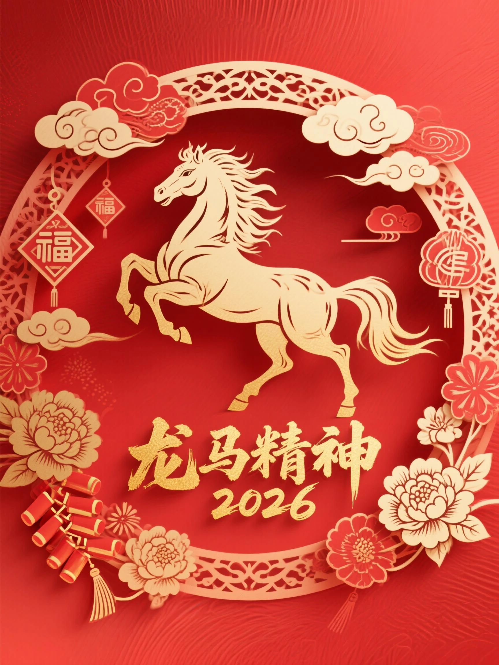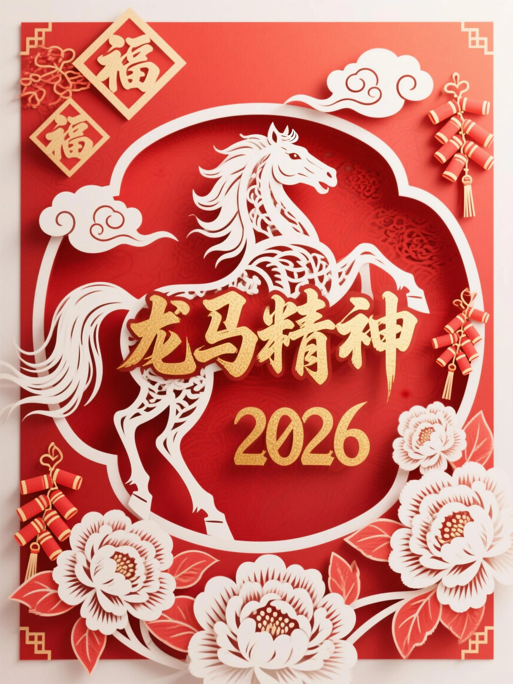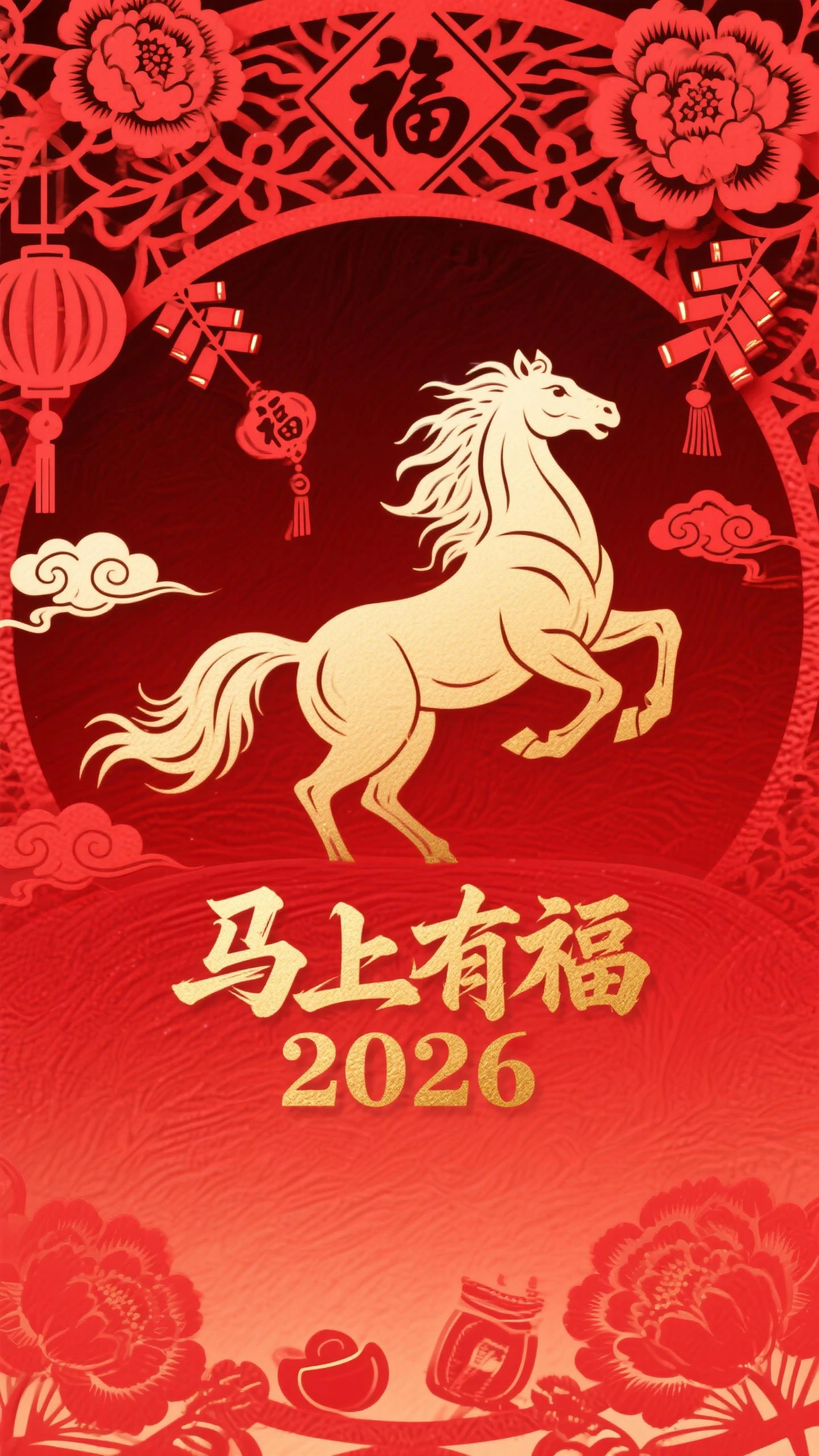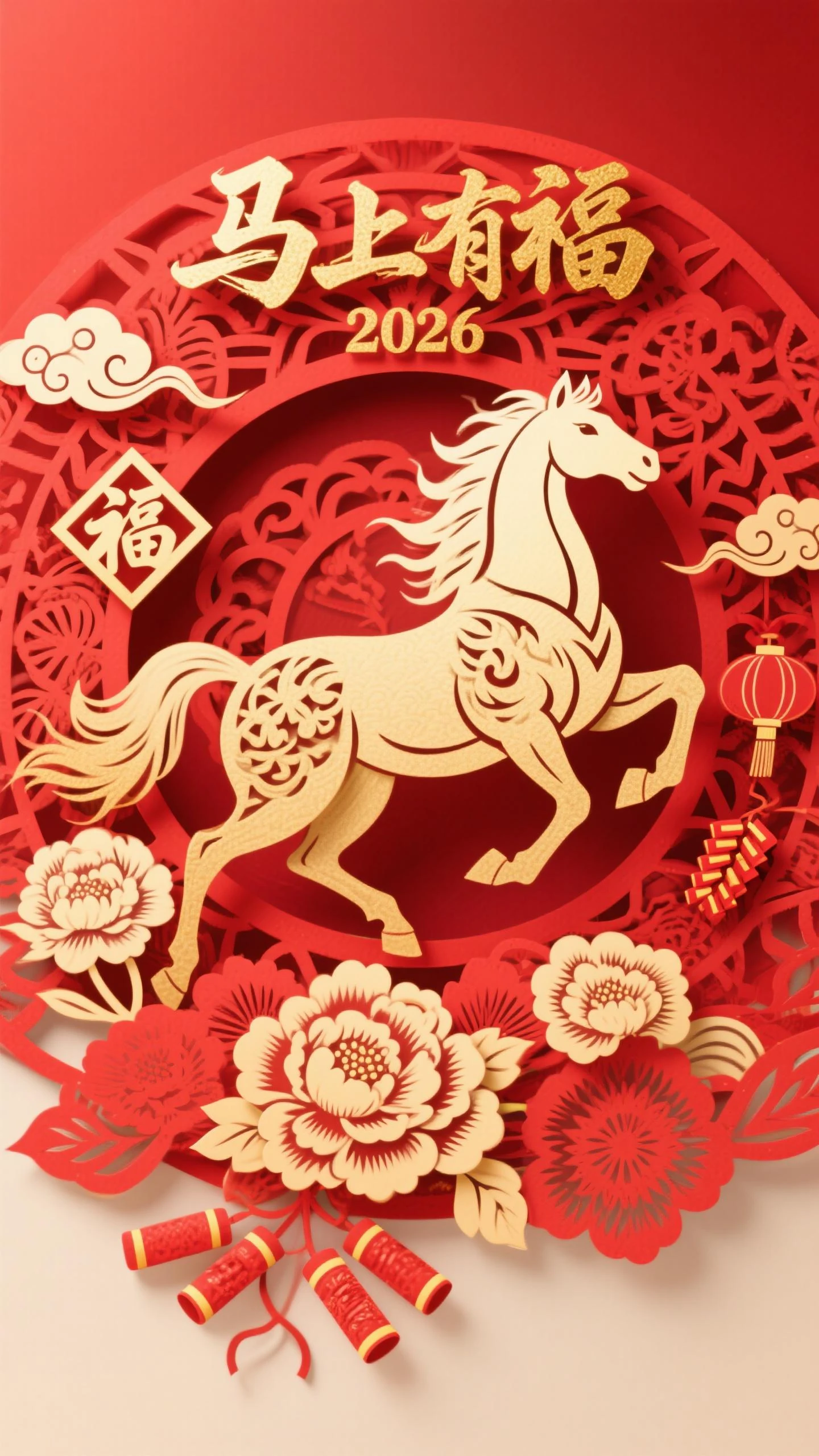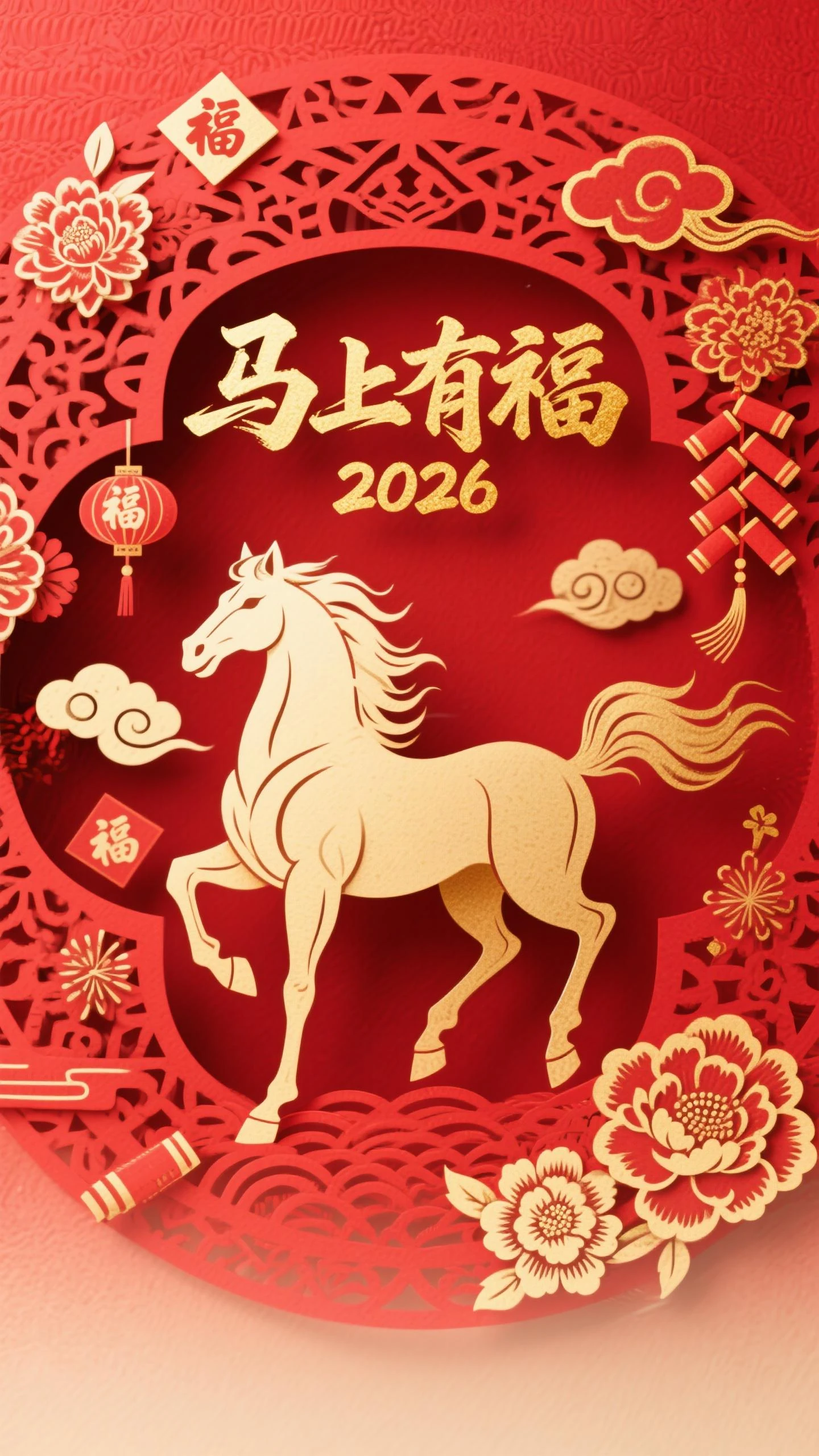 2026 马年新春,AI 融合传统剪纸艺术,主体为镂空雕刻的昂首骏马剪纸,周围环绕祥云、福字、鞭炮、牡丹剪纸纹样;背景是渐变中国红底色,AI 生成的细微纹理增强剪纸层次感;画面中央有 “马上有福 2026” 字样,喜庆吉祥,平面设计风格,高清细节,边缘锐利,色彩纯正。中国年讲究传统,讲传统的剪纸艺术融入新年祝福中,喜庆且寓意深刻。