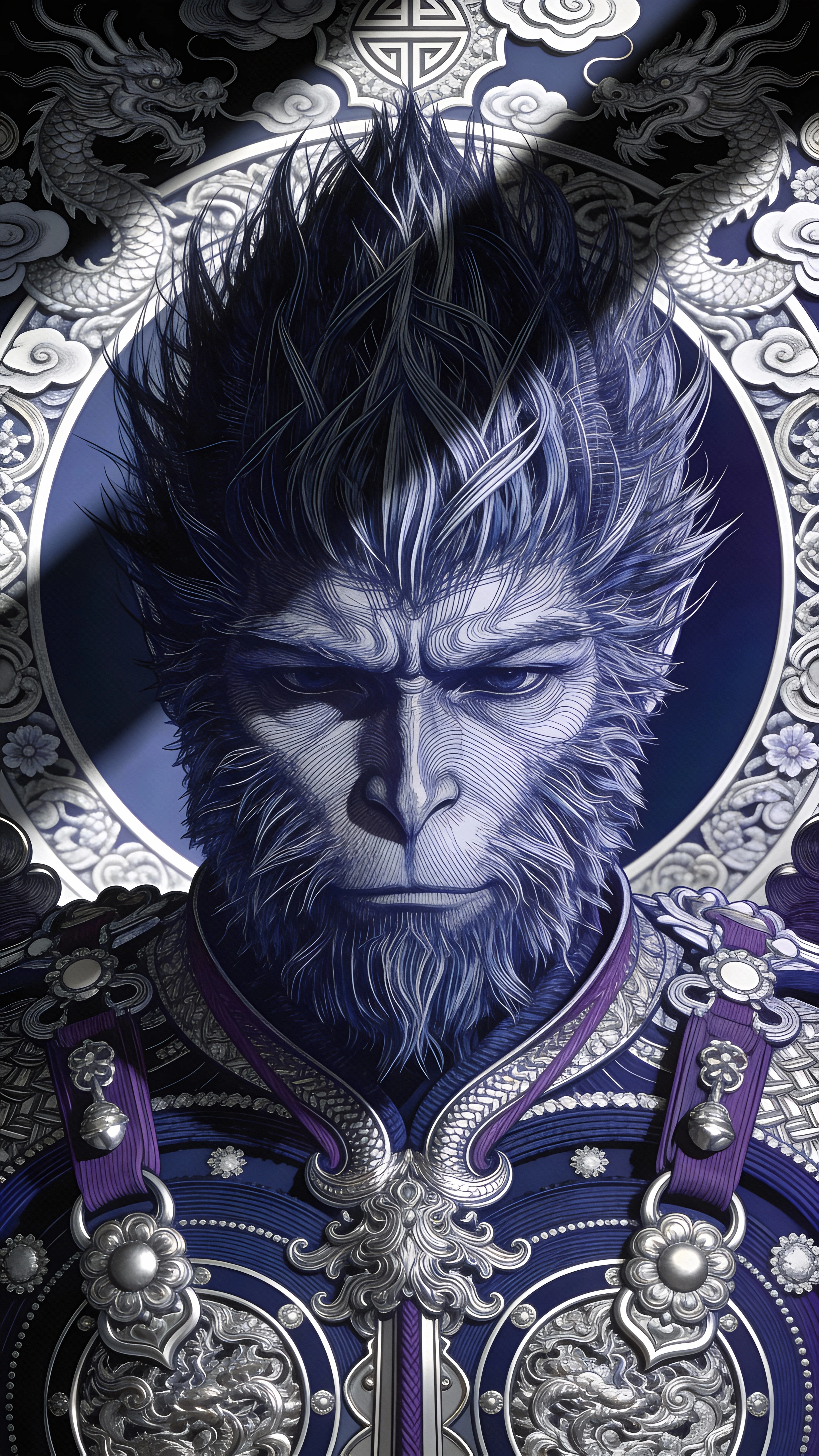 Adam Riches风格作品,肖像的精密线条,以单线连续线条绘画,让木炭在纸上游走成即兴的排线,他的线条时而密集,时而疏朗,构筑立体感,层层叠叠,这些看似无序的线条轨迹,最终重构出古典巴洛克风格与极繁主义叙事。 拟人国风雕,神秘感,华丽炫酷的花纹和质感、冷色调,整个画面散发出一种美轮美奂的诡异气质,惊艳迷人却又令人感觉到危险和恐惧,极致的细节刻画,极致的立体纹理,奢华、繁琐、恢弘、大气,超高清画质。韦陀,正脸。