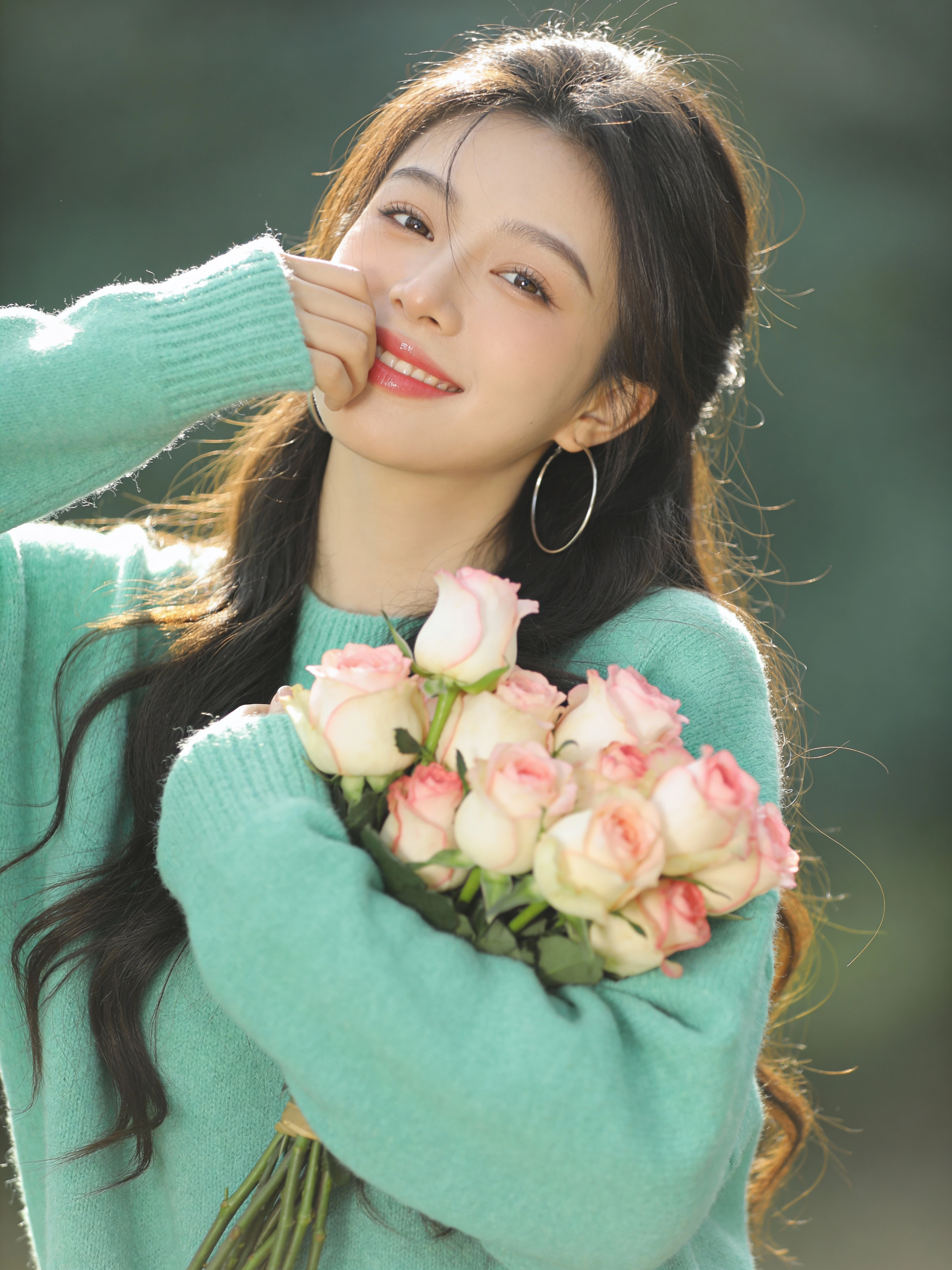 日常快照风格高质量图像,中景镜头,看镜头眼神妩媚,网感妆,网感少女,超高颜值美少女,网感头像,冷白皮,瓷白肌肤、奶油白肌肤,自然松弛,网感妆,自然光线,暖调滤镜,少女感网拍,概念风美学,情绪氛围感,慵懒氛围感,展现冰瓷玉肌冷白皮绝世美人,穿着蒂芙尼绿色毛衣,抬头捂嘴微笑,侧边半扎长卷发垂直胸前,发丝凌乱 银色大圈耳环,手捧一束玫瑰花,背景同色