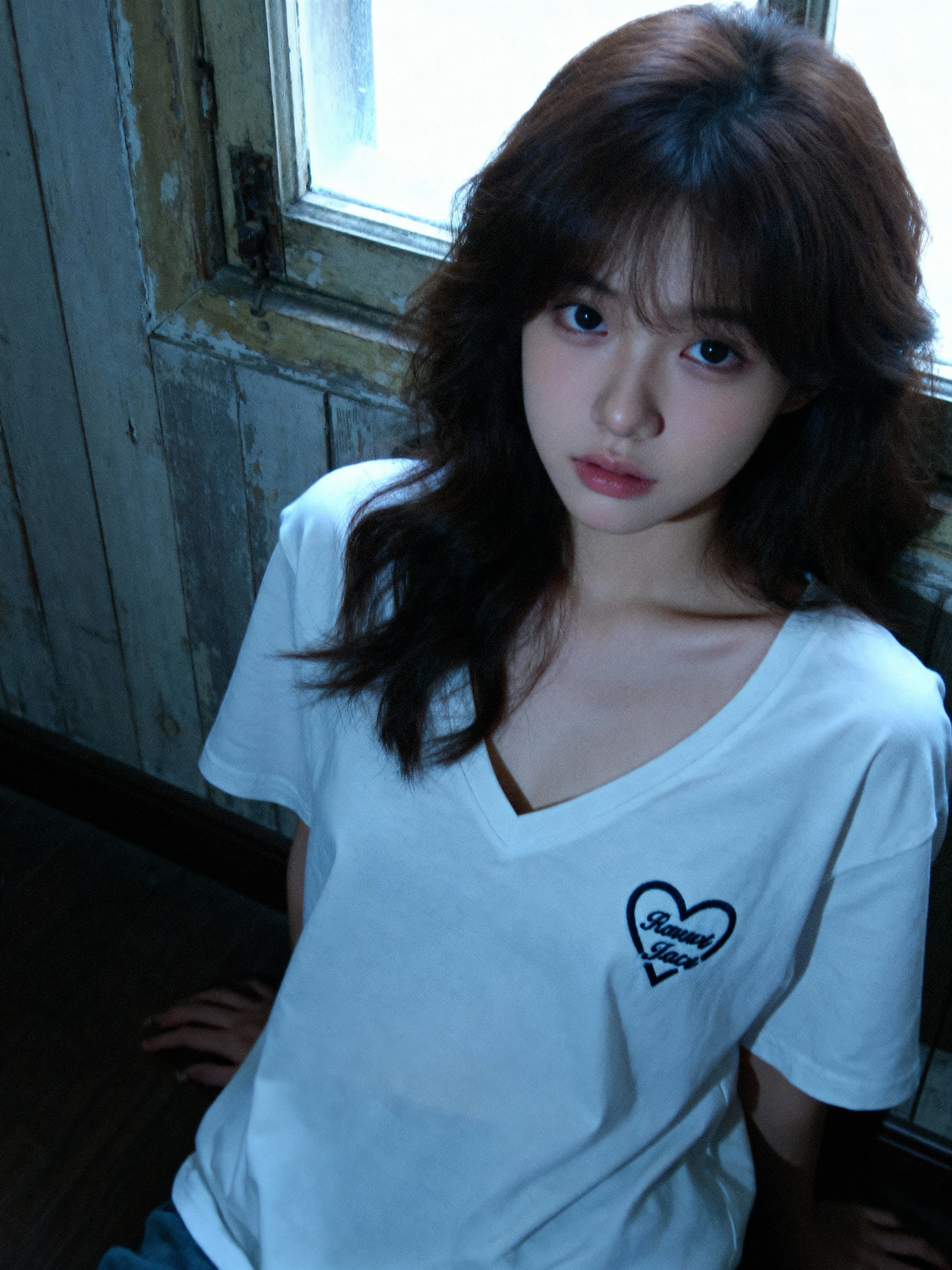 湛佳琳CCD拍摄风格,深栗棕色森系发型,长相呆萌可爱的钝感女生,仅穿着心形印花刺绣印字T恤,以凸显身材,在暗冷调静谧房间,带着羞涩的微表情,镜头拉进聚焦身材,整体构图随意平庸,具有因快门速度不足导致的运动模糊效果,充满生活气息的快照风格。比例 9:16。深V,玉肩,令人震撼的俯拍视角
