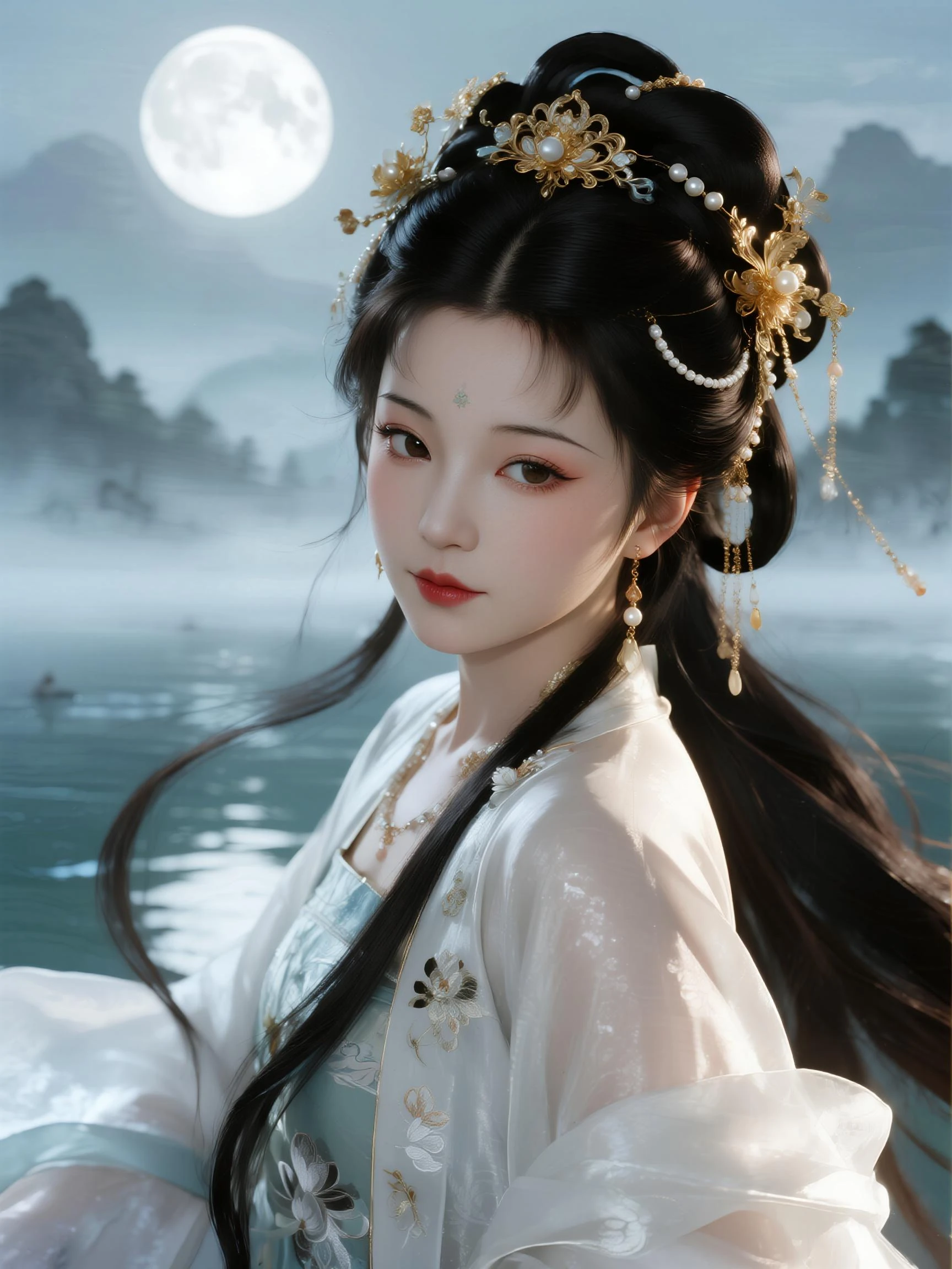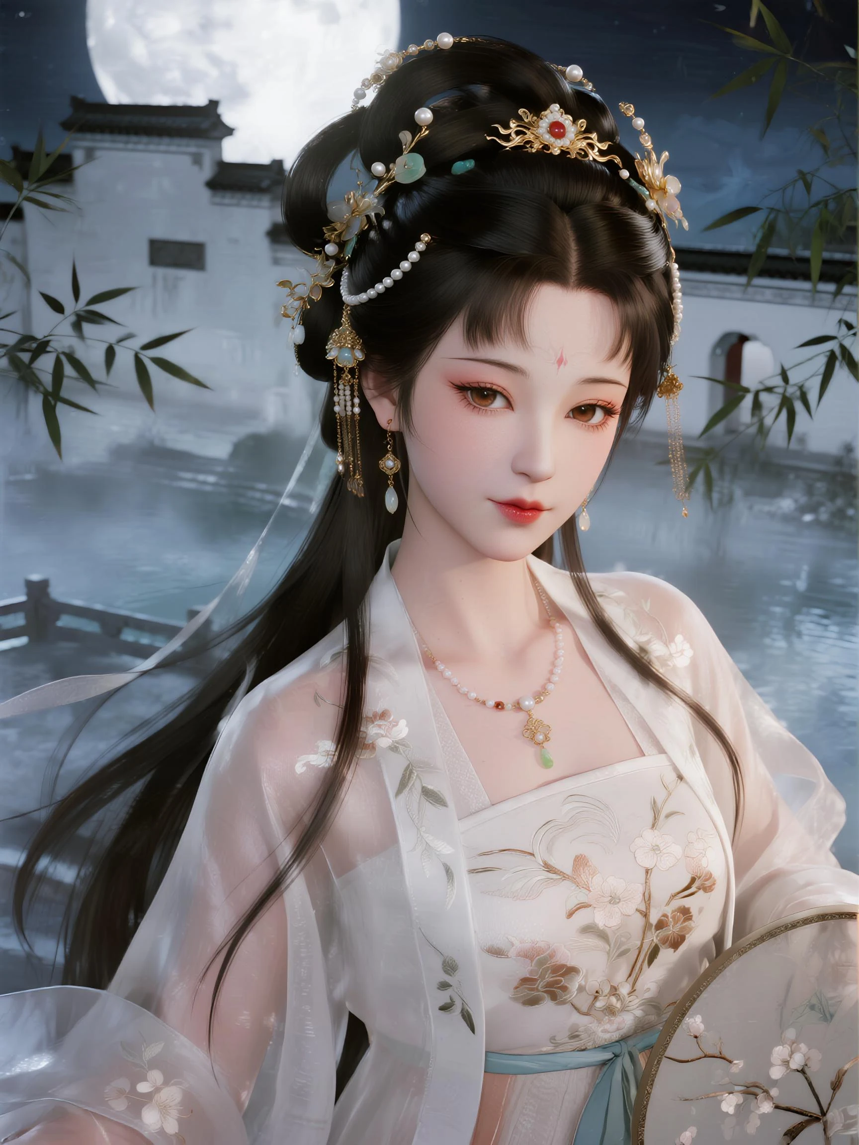 三维古风,国风光影,玉骨冰肌,国风动漫画风,飘逸的黑色长发,复杂精致的中式发髻,华丽的发饰,吹弹可破的柔嫩肌肤,魅惑的大眼睛,娇俏的鼻子,红红的小嘴唇,穿着白色精美华丽的汉服,高贵优雅,磨砂,高质量,梦幻,逼真,合理布局,比例协调 负向咒语: