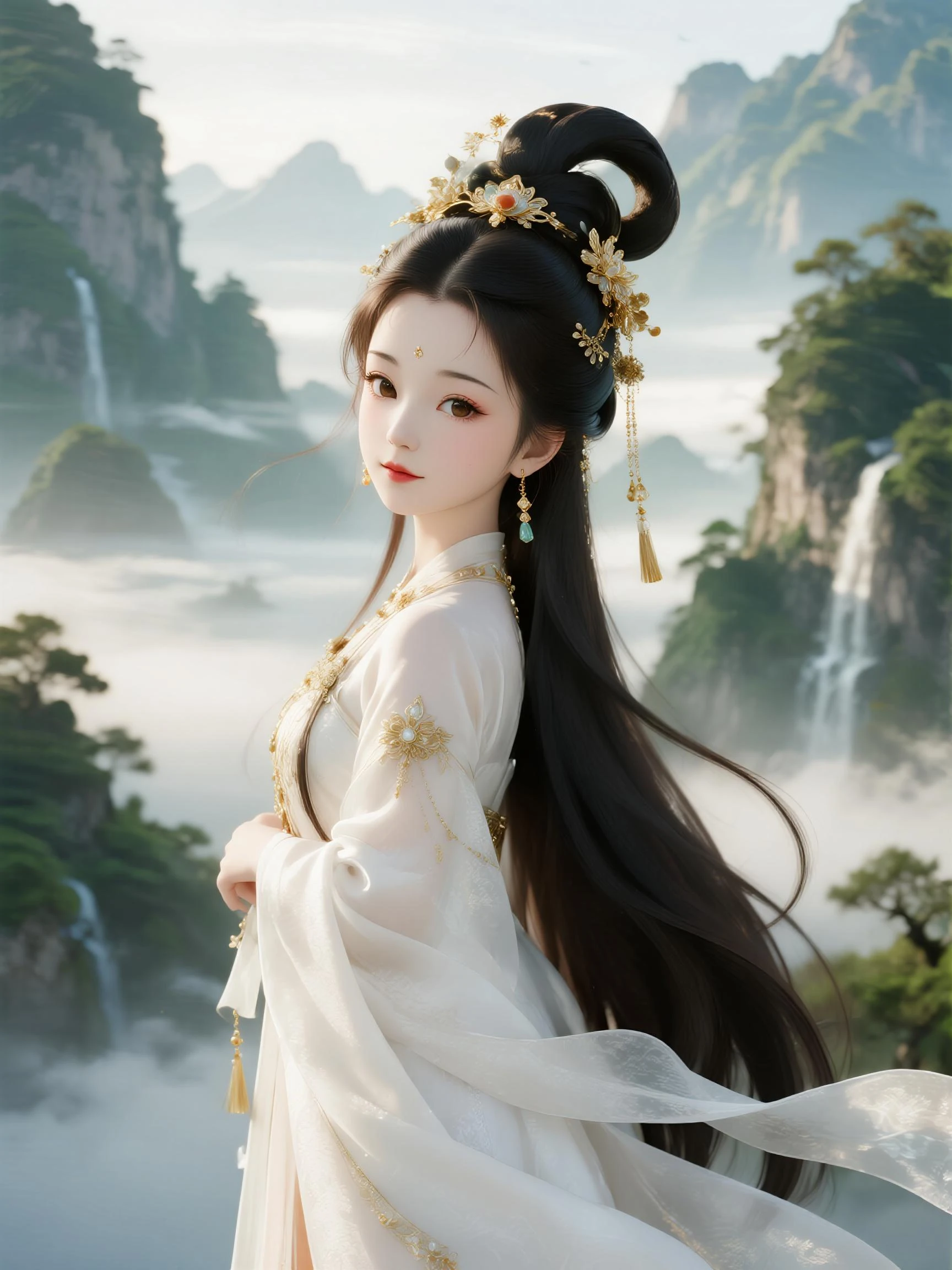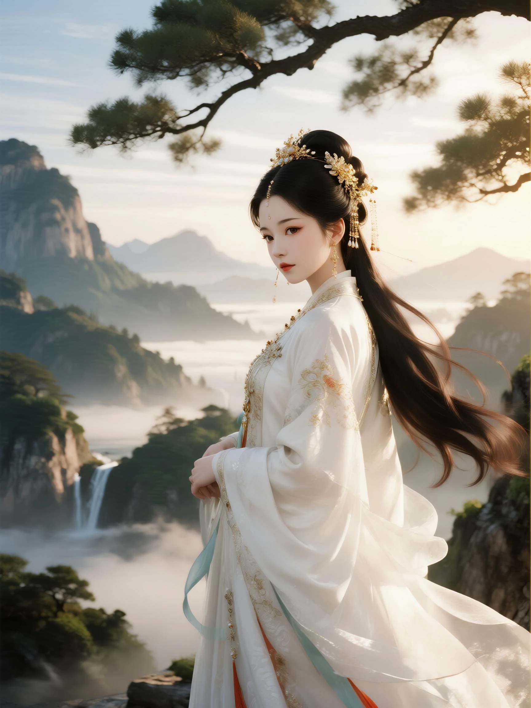 暖金色的晓光漫覆层叠云崖,山风卷着湿润的雾气,掠过崖边苍劲的老松。松枝的阴影轻覆在崖畔静立的白衣女子肩头,她身着绣着缠枝金纹的广袖仙衣,衣料在山风里轻轻扬起,柔滑的光泽在晨光里缓缓流动。乌发高挽,鎏金与珠贝缀成的发饰在光中微闪,垂落的细链随着山风轻晃,额间的碎金饰映着晓光,添了几分清贵。身后的山谷间,白雾如棉絮般贴着地面缓缓铺开,远处的瀑布垂落崖壁,溅起的水汽融进朦胧的雾色,层叠的远山在雾霭后只显露出柔和的灰蓝轮廓。山风掠过她的发梢,带着林间草木的清润气息,整个天地都浸在这静谧又通透的晓色里,时光仿佛在此刻悄然凝滞。