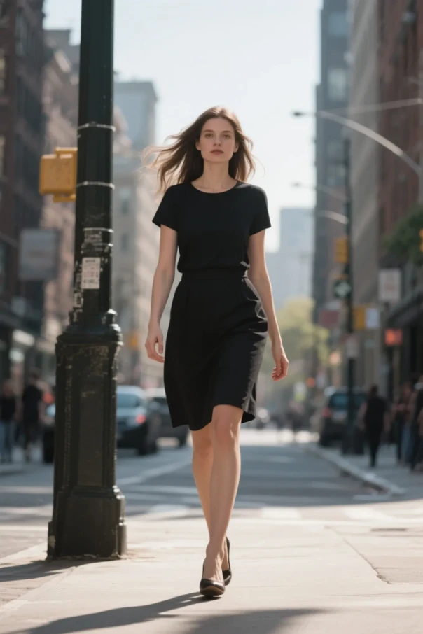 ● 【动作】人物从街道远端缓缓走来,步伐平稳,双臂自然摆动,裙摆随节奏轻盈晃动