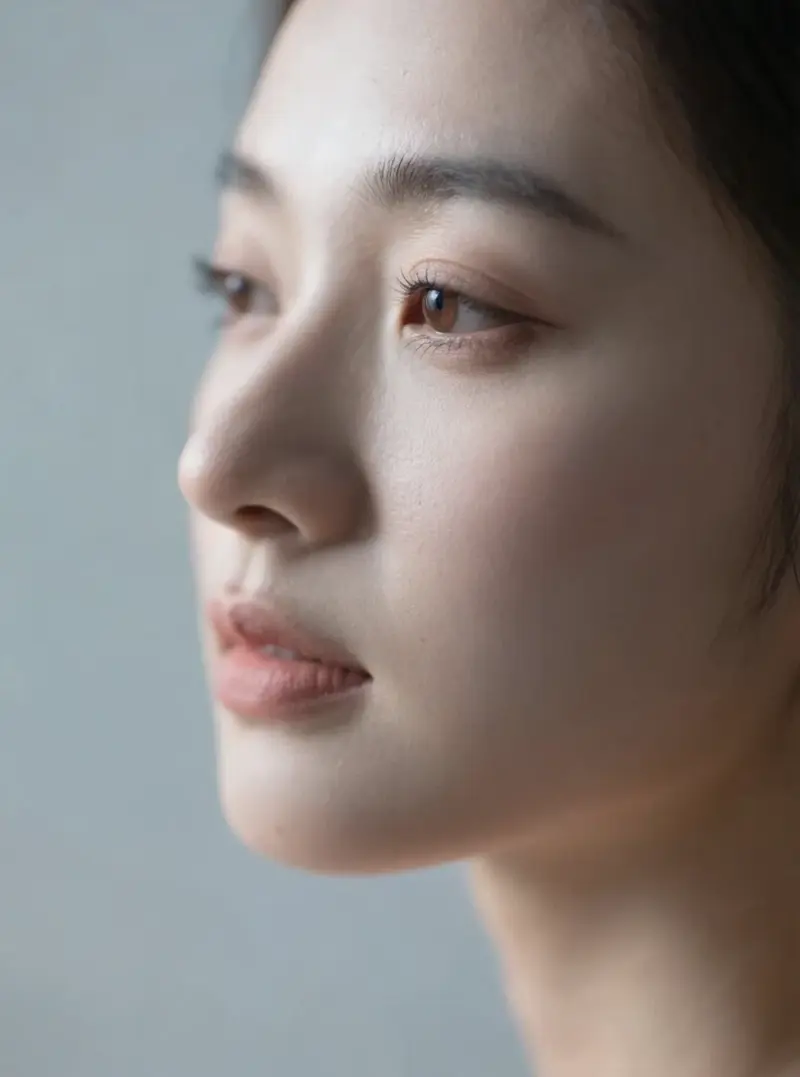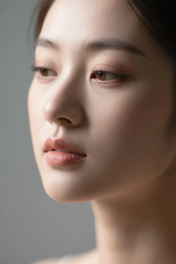 超写实的年轻女性面部特写肖像,面部轮廓清晰,皮肤毛孔真实可见,睫毛细节丰富,柔和漫射光,影棚摄影风格,高分辨率,照片级写实,背景虚化。