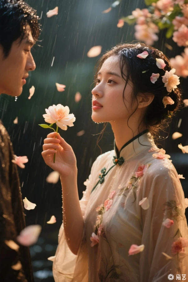 作品提示词:花瓣雨中的女孩, 向她的爱人献上一朵完美的花, 慢动作捕捉, 花瓣粘在她的头发和湿润的襦裙上, 高度电影化, 感官超载