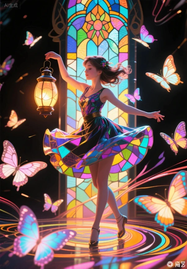 作品提示词:女孩手持蝴蝶灯笼跳舞,周围环绕着发光的蝴蝶,装饰艺术风格,彩色玻璃效果,鲜艳的色彩,动作线条,优雅的动作
