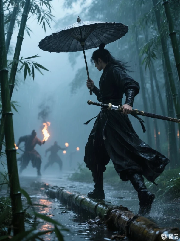 作品提示词:国风武侠风格,竹林中的雨夜,穿黑色劲装的侠客撑着黑色油纸伞,伞下藏着一把佩剑,侠客脚步轻盈踏过湿滑竹根,雨水打在竹叶上沙沙响,远处有追杀者的火把光点,氛围紧张刺激