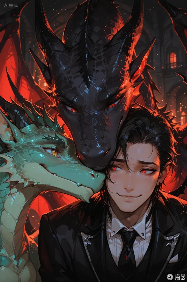作品提示词:可爱的恶魔管家在向一条凶猛的龙耳语的特写镜头, 龙看起来困惑和好奇, 恶魔有一个狡猾的笑容, 电影灯光, 奇幻风格, 超详细
