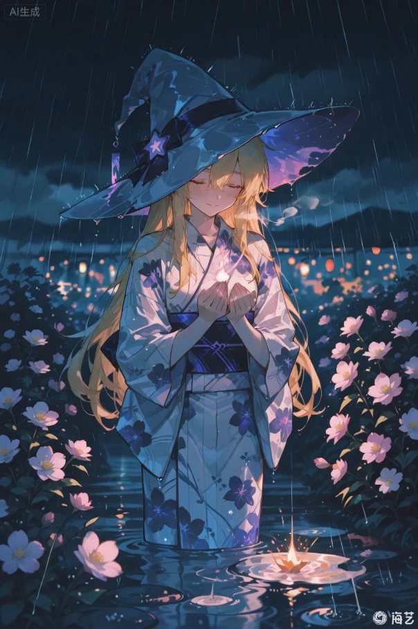作品提示词:穿着浴衣的女巫吸收并散发香气, 释放夜间盛开花朵的香气, 干涸大地上的雨, 和节日美食, 共感魔法, 令人回味的