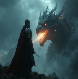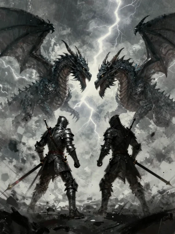 闪电撕裂云层,龙息照亮骑士侧脸;真实光影,画面干净,主体居中构图,高清细节,电影感调色。
