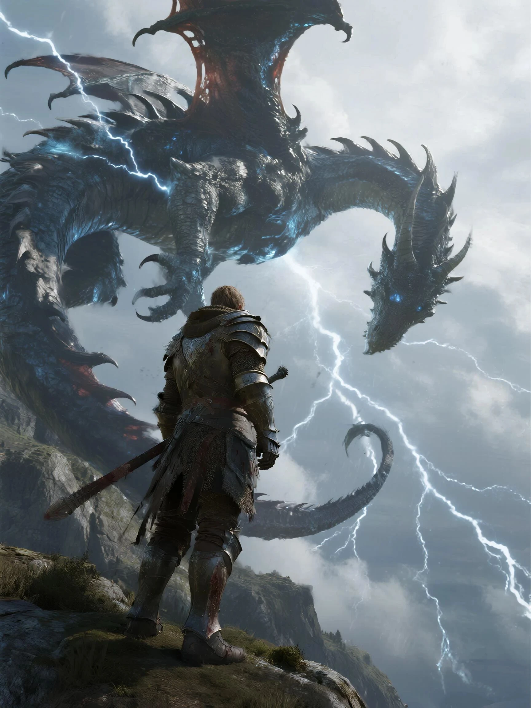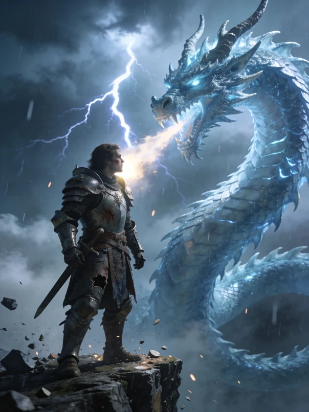 提示词:史诗写实风格,一位伤痕累累的重甲骑士站在暴风雨悬崖顶,与巨大寒光巨龙对峙;