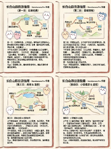 提示词:生成四天的长白山的旅游指南 ,每一天一张图,手账形式,整体风格用chikawa三小只,纯中文,信息可以足够详细一点。