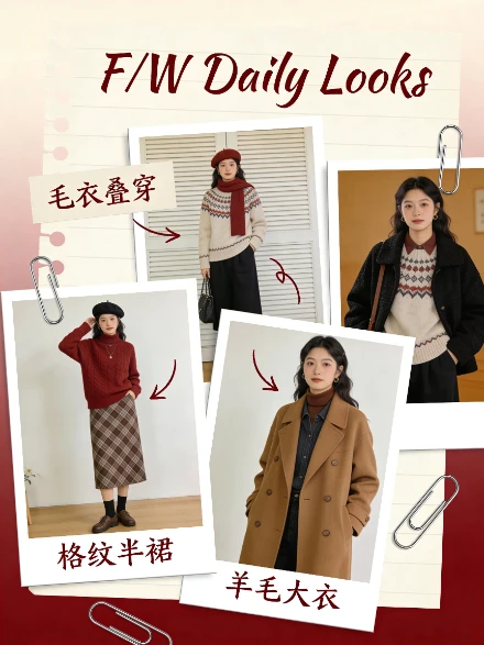提示词:复古杂志排版,米色+酒红色背景。模特造型拼贴、手写标注、金属别针装饰。标题“F/W Daily Looks”
