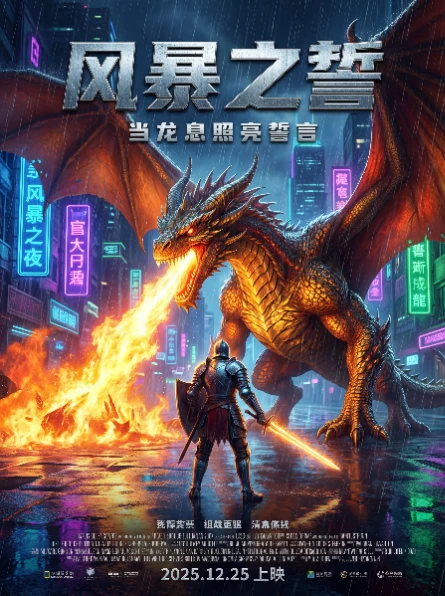 制作电影海报:中心画面为骑士与巨龙对峙,雨夜霓虹冷暖对比光,地面湿反光;