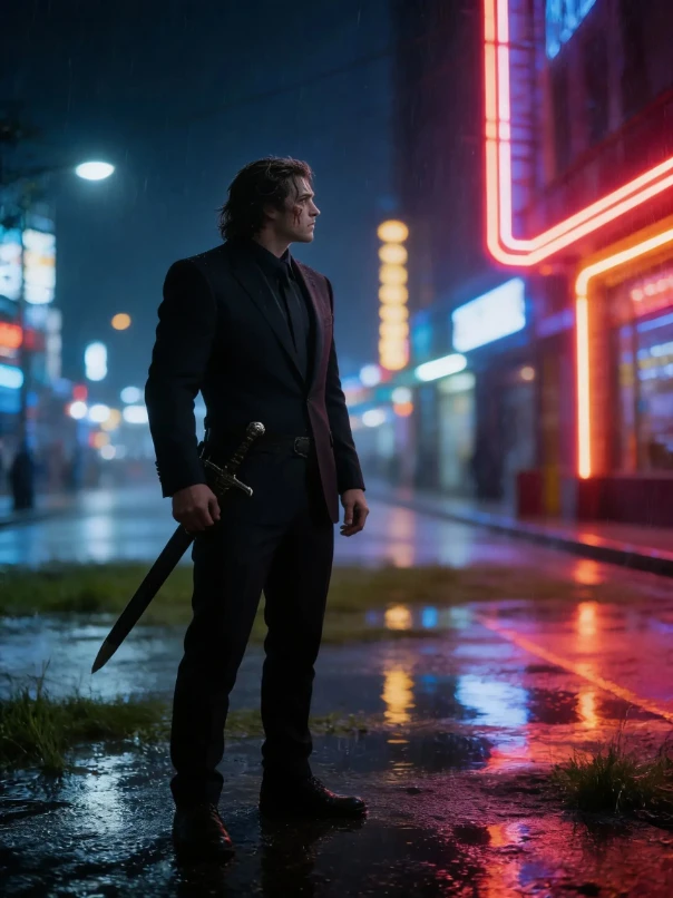 场景改为雨夜霓虹街头,增加湿地反光与霓虹边缘光;