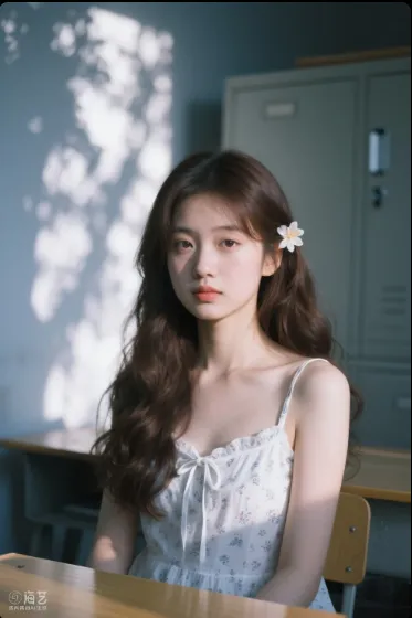 一张数码相机展示屏截图,16岁美少女,真人,绝美,长发,校园场景,斑驳树影,颗粒感,漏光,强烈胶卷效果。模糊,冷调,展示数码相机拍摄时参数怼脸拍,清晨刚醒, 老照片的做旧感,低饱和度,朦胧迷离感,胶片特有的明显的颗粒感和噪点,特写,女人半边脸,流动斑驳的光影投在肌肤上,脸上,发梢上,虚化的花,朦胧迷离,画面美得动人心弦,光影变幻,如诗如梦 我生成图片:主要是一位可爱女生,深棕色波浪及腰长发系带束缚,穿着白色暗花吊带裙风格cos服,衣服质感轻薄层次分明,轻盈感觉呈现,坐在有昏暗墙壁和柜子的背景前桌子上,在强烈闪光灯下夺目,湛佳琳ccd拍摄,因快门速度不足导致运动模糊,构图随意充满生活气息,光影突出人物主体,清新自然风格,特写,简洁明快氛围,构图平衡