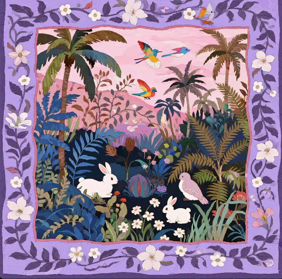 繁复精致的爱马仕丝巾纹样 阿尔丰斯穆夏 融合鸟山明的想象力 吴冠中 线条灵动、精准、清晰 充满质感。极繁设计 神秘 奇幻 充满感染力 迷幻视觉效果。融合莫奈的调色盘。 以藕紫为主色调 画面边框由叶子边框环绕 仿佛一扇通往神秘世界的窗。内部是丰富的自然与动物融合景观 棕榈树、蕨类等多样植物错落 勾勒出繁茂生态。等序排列 画面饱满 深浅不一的紫蓝色营造层次感 点缀白色花卉、彩色小鸟 白色小兔 增添画面灵动。粉色 墨绿色和深棕色搭配 松木质感 时尚复古 工笔画技法 线条勾勒笔触 整体风格细腻且富有想象力 高定风格 HERMES