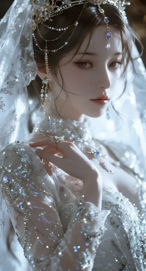 布满精致璀璨珠饰与亮片的白色纱织长袖刺绣婚纱、头戴奢华珠宝流苏头饰、身披轻柔头纱的女子,3d动漫厚涂,插画,磨砂肌理绘画,高级CG,oc渲染,特写,近距离,动态视角,人物特写,梦幻,神秘,深邃,清冷,高雅,唯美,朦胧,华丽,光影交错,光影对比强烈,光影斑斓,超高清,8K,极致超清,细节丰富,精致刻画,线条流畅,发丝细腻,柔焦,高质量,大师级光影