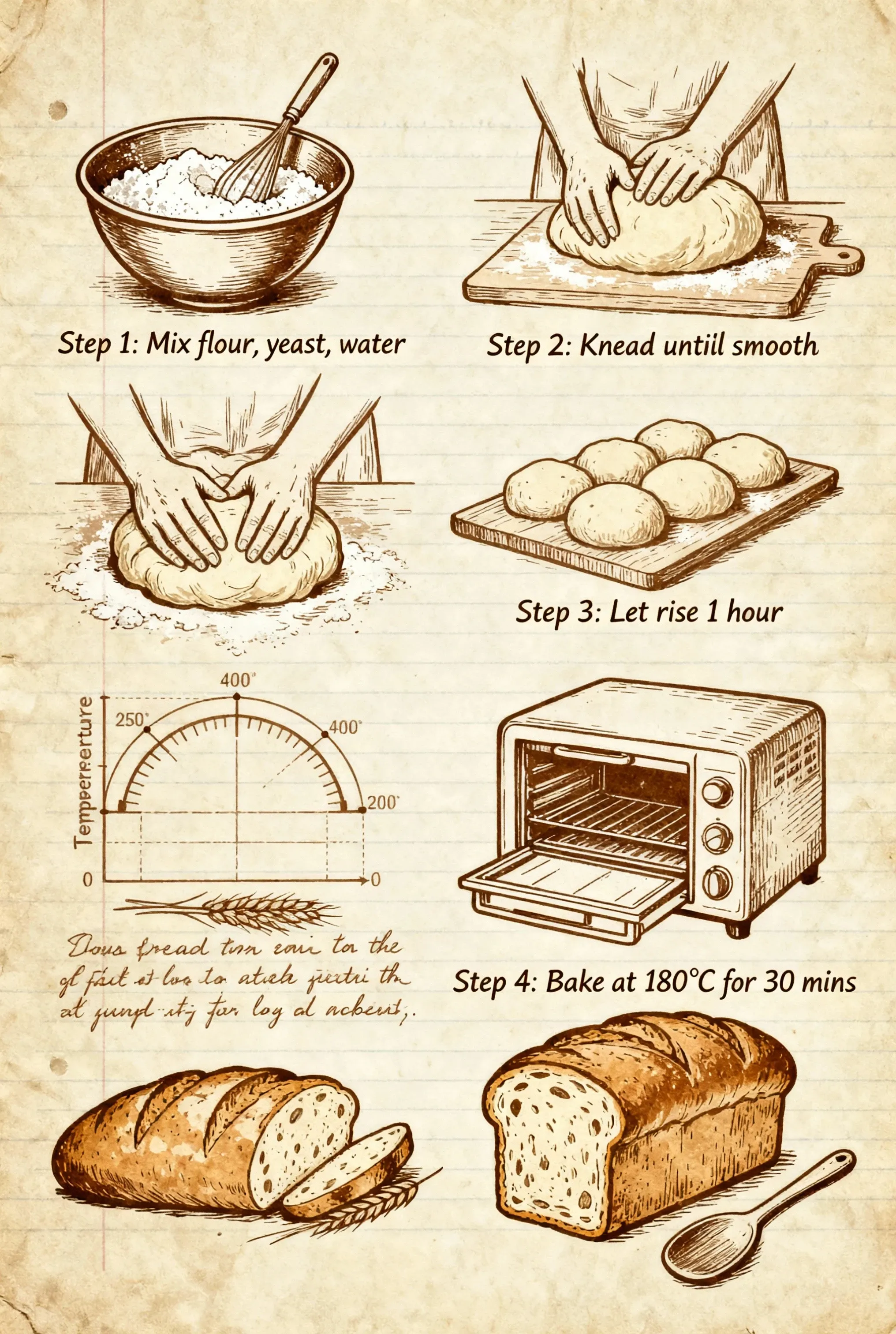 指令:「创作手绘食谱风格的传统面包烘焙示意图」